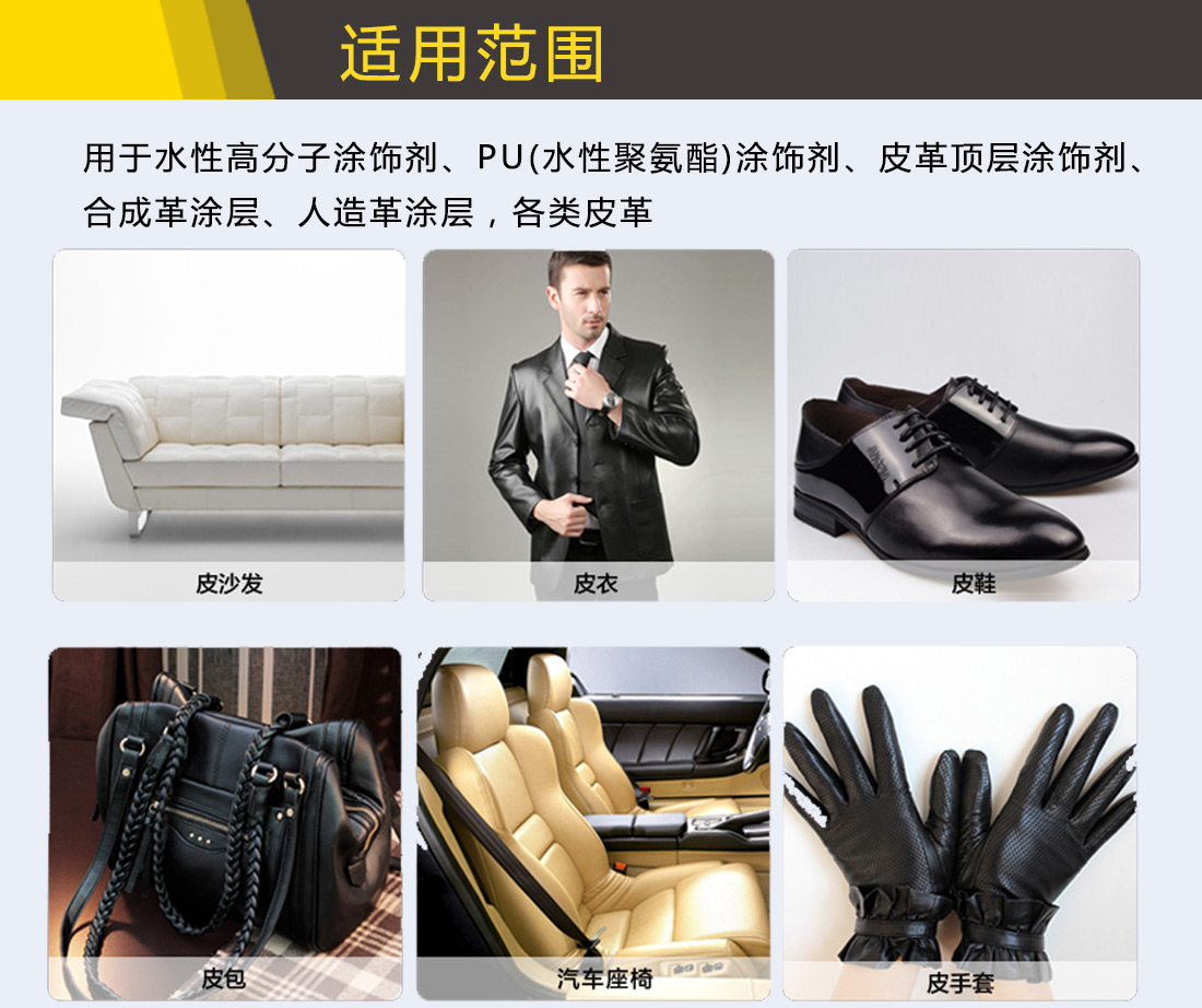 使用范圍:水性高分子涂飾劑; PU(水性聚氨酯)涂飾劑、皮革頂層涂飾劑; 合成革涂層、人造革涂層; 真皮表面。