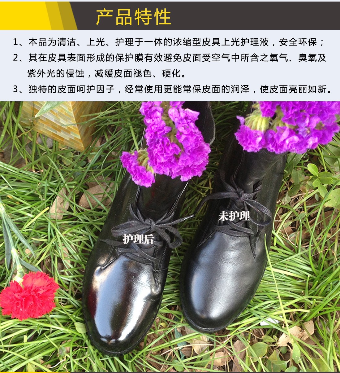 使用范圍:本品專用于各類光面皮表面的上光滋養(yǎng)呵護(hù)(如皮衣、皮沙發(fā)、皮包、皮椅、皮鞋等各種光面皮制品表面)。